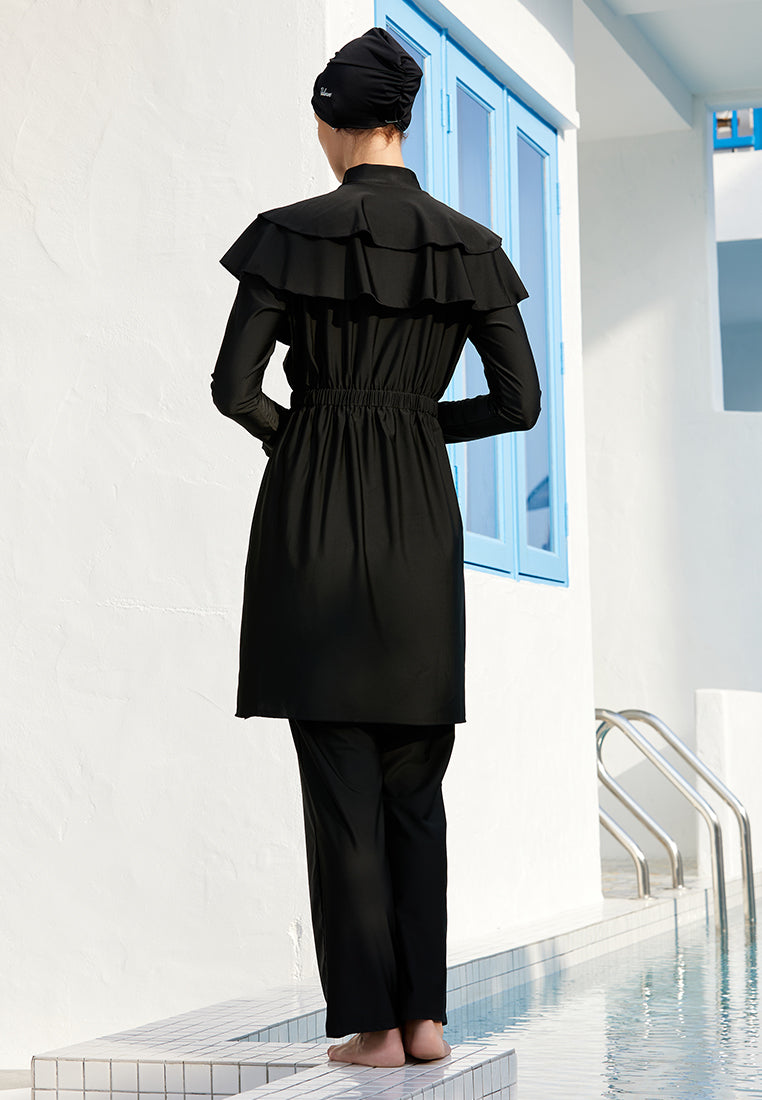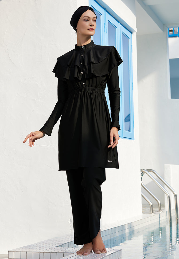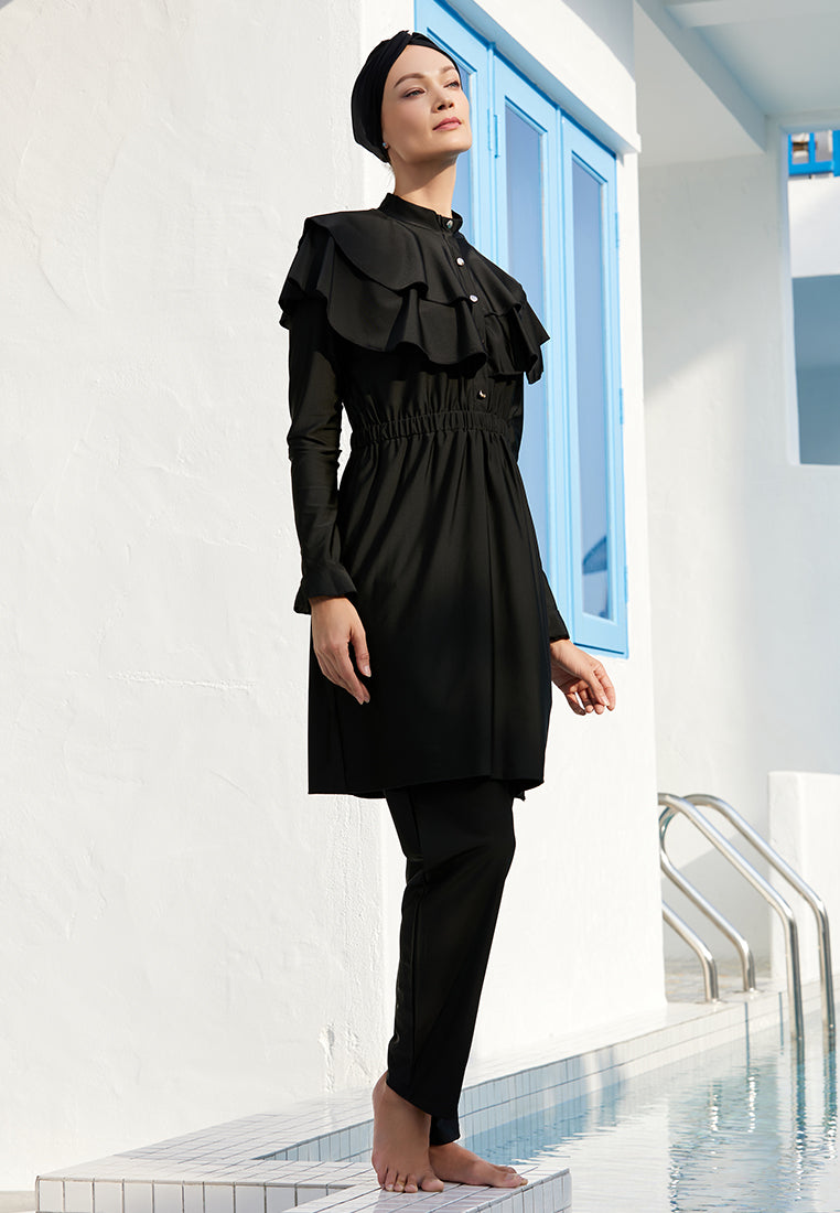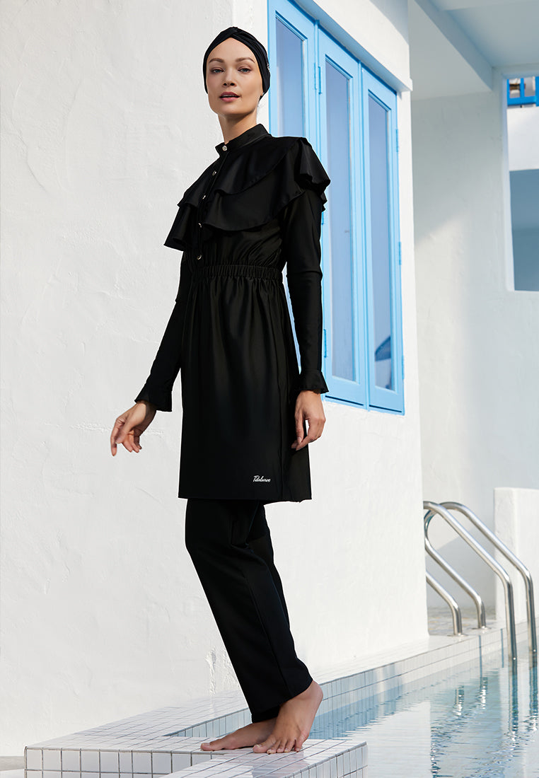 Our Tidalwave Layla Modest Beachwear is designed in a timeless black hue, allowing the ruffle designs to shine.