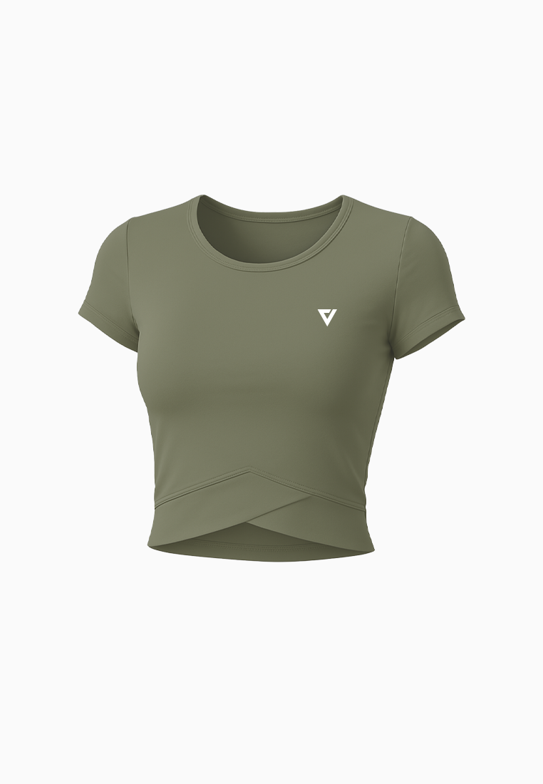 This cropped active top features a classic round neckline and short sleeves, paired with a stylish layered hemline for a trendy finish. Designed with built-in bra pads, it offers all-day support and a sleek silhouette. Perfect for a casual day out with minimal styling or a lazy day at the pickleball court.
